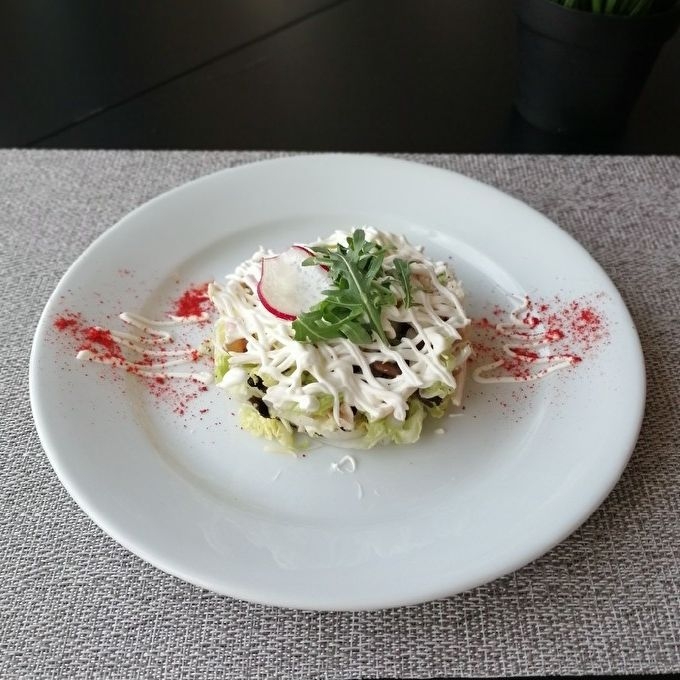 Курица копченая, кукуруза, помидор, сыр, яйцо, зелень, майонез.