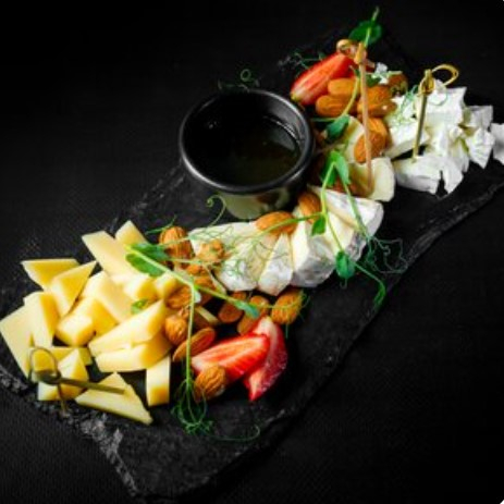 Сыр фета, сыр пармезан, сыр бри, мёд, клубника, миндаль.