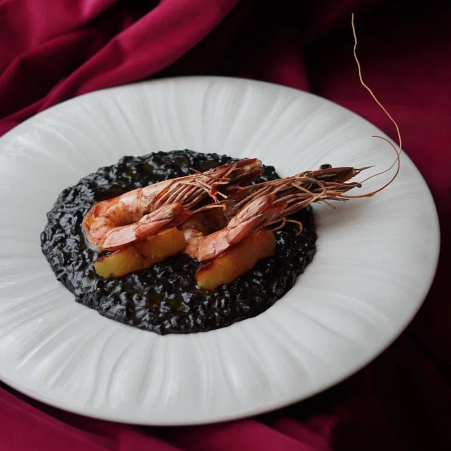 Тигровые креветки, карамелизированный ананас, пармезан, сливки, сливочное масло, чёрный ризотто, рис арборио, белое вино, чернила каракатицы.