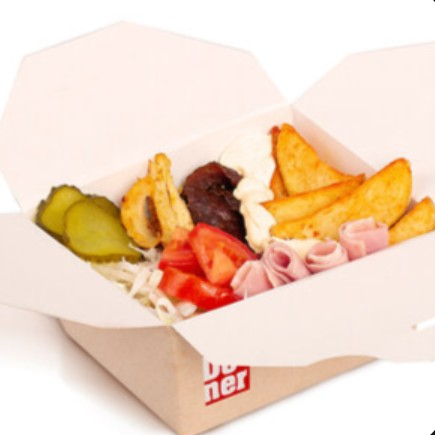 Курица с вертела, говядина с вертела, бекон, маринованный огурчик, лук, томат, капуста, соус Грибной, картофельные дольки.