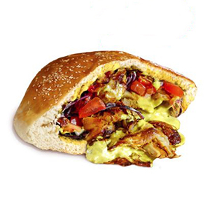 Нарезанное тонкими пластами мясо курицы-гриль на свежевыпеченной турецкой лепёшке с кунжутом в сочетании с помидорами и листьями салата, с соусом на выбор: фирменный, чесночный, чили, сметанный.