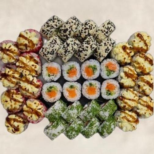1. Ролл Филадельфия с огурцом - рис, нори, сыр, огурец, шапка лосось. 2. Ролл кура-бекон - рис, нори, сыр, курица, перец, шапка бекон опаленный. 3. Ролл краб - рис, нори, сыр, огурец, краб, в черном кунжуте. 4. Ролл запечённый чикен - рис, нори, сыр, курица, перец, сверху сырная шапочка. 5. Ролл запечённый тунец - рис, нори, сыр, тунец, огурец, в черно-белом кунжуте, сверху сырная шапочка.