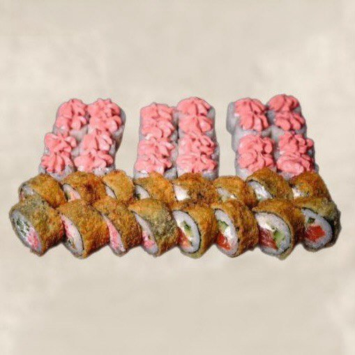 1. Ролл темпура с крабом - рис, нори, сыр, огурец, краб, кляр+ранко сухари. 2. Ролл темпура с лососем - рис, нори, сыр, огурец, лосось, кляр+панко сухари. 3. Ролл запечённый калифорния - рис, нори, сыр, краб, сверху сырная шапочка. 4. Ролл запечённый лосось - рис, нори, сыр, лосось, сверху сырная шапочка. 5. Ролл запечённый тунец - рис, нори, сыр, тунец, сверху сырная шапочка.