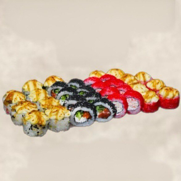 1. Ролл Калифорния - рис, нори, сыр, краб, огурец, в красной тобике. 2. Ролл Африка - рис, нори, сыр, лосось, огурец, в черном кунжуте. 3. Ролл запечённая Калифорния - рис, нори, сыр, краб, огурец, в красной тобике, сверху сырная шапочка. 4. Ролл запечённый Чикен - рис, нори, сыр, курица, огурец, в черно-белом кунжуте, сверху сырная шапочка.