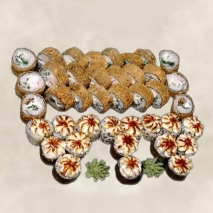 1. Ролл Калифорния - рис, нори, сыр, краб, огурец, в красной тобике. 2. Ролл Африка - рис, нори, сыр, лосось, огурец, в черном кунжуте. 3. Ролл запечённая Калифорния - рис, нори, сыр, краб, огурец, в красной тобике, сверху сырная шапочка. 4. Ролл запечённый Чикен - рис, нори, сыр, курица, огурец, в черно-белом кунжуте, сверху сырная шапочка.