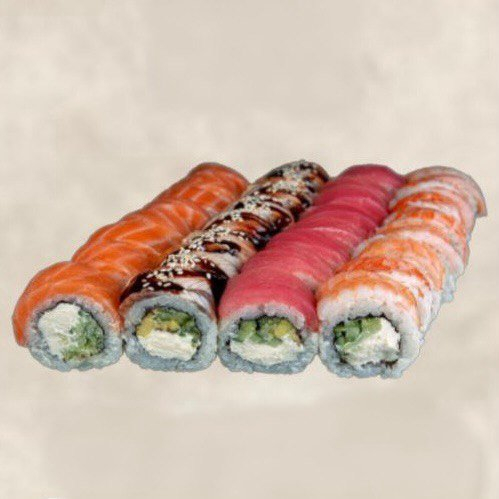 1. Ролл Бонито - рис, нори, сыр, курица, огурец, в стрижке тунца. 2. Ролл Африка - рис, нори, сыр, лосось, огурец, в черном кунжуте. 3. Ролл Калифорния - рис, нори, сыр, краб, огурец, в белом кунжуте. 4. Ролл запечённый Чикен - рис, нори, сыр, курица, огурец, сверху сырная шапочка. 5. Ролл темпура краб - рис, нори, сыр, краб, огурец, кляр+панко сухари.