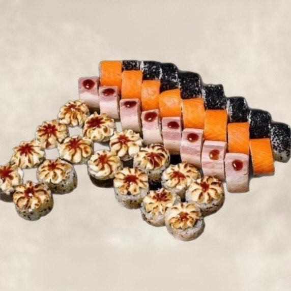 1. Ролл Филадельфия с огурцом - рис, нори, сыр, огурец, шапка лосось. 2. Ролл Калифорния - рис, нори, сыр, краб, огурец, в красной тобике. 3. Ролл с тунцом - рис, нори, сыр, тунец, дайкон. 4. Ролл запечённый лосось - рис, нори, сыр, лосось терияки, огурец, сверху сырная шапочка. 5. Ролл запечённый с мидиями - рис, нори, сыр, мидии, дайкон, сверху сырная шапочка.