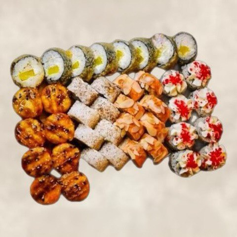 1. Ролл Филадельфия с огурцом - рис, нори, сыр, огурец, шапка лосось. 2. Ролл Карибы - рис, нори, сыр, огурец, шапка креветка. 3. Нигири 1шт - рис, лосось. 4. Ролл запечённый чикен - рис, нори, сыр, курица, огурец, в черном кунжуте, сверху сырная шапочка. 5. Ролл запечённый тунец - рис, нори, сыр, тунец, сверху сырная шапочка. 6. Ролл темпура лосось - рис, нори, сыр, лосось, огурец, кляр+панко сухари.