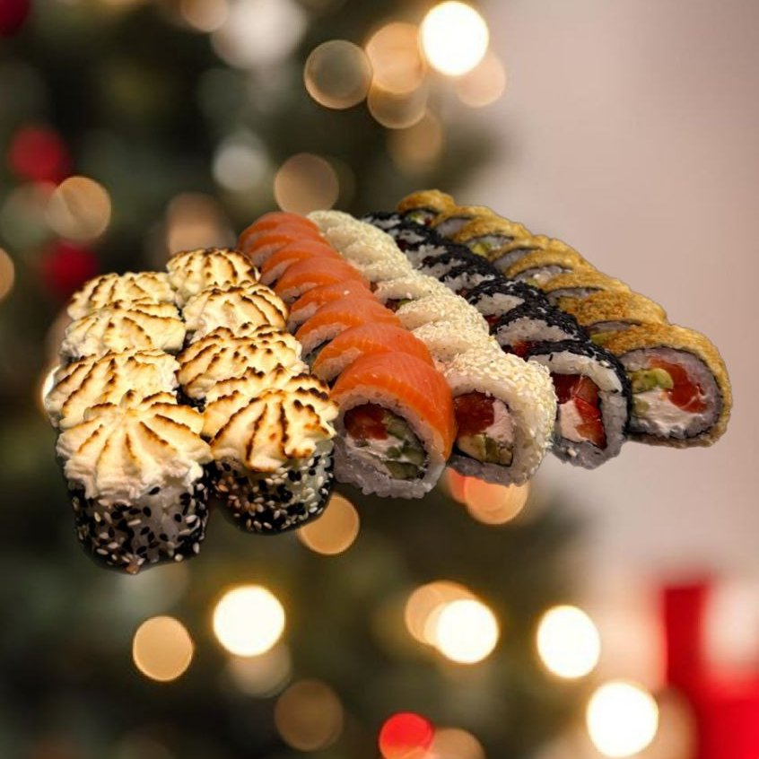 1. Ролл Калифорния - рис, нори, сыр, краб, огурец, в красной тобике. 2. Ролл Африка - рис, нори, сыр, лосось, огурец, в черном кунжуте. 3. Ролл запечённая Калифорния - рис, нори, сыр, краб, огурец, в красной тобике, сверху сырная шапочка. 4. Ролл запечённый Чикен - рис, нори, сыр, курица, огурец, в черно-белом кунжуте, сверху сырная шапочка.