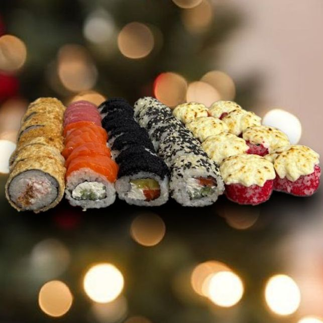 Заказать 1. Ролл филадельфия: рис, нори, сыр, огурец, шапка тунец+шапка лосось. 2. Ролл с лососем в черно-белом кунжуте: рис, нори, сыр, лосось, огурец, в черно-белом кунжуте. 3. Ролл с лососем в чёрной тобике: рис, нори, сыр, лосось, в черной тобике. 4. Ролл запеченный: рис, нори, огурец, окунь, в красной тобике, сверху сырная шапочка. 5. Ролл темпура: рис, нори, краб, лосось терияки.