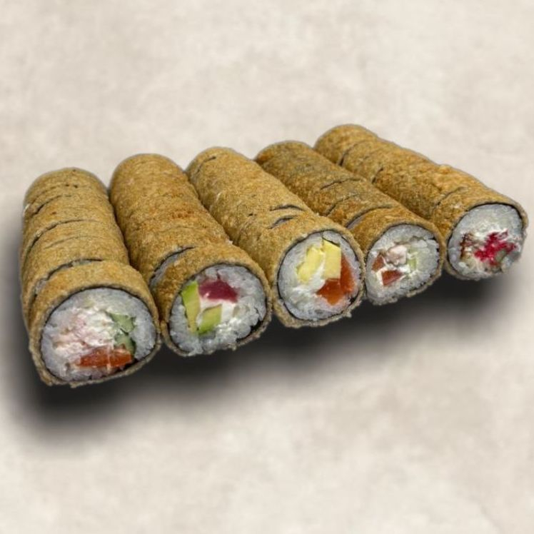 Заказать 1. Жареный ролл с курицей (рис, нори, сыр, курица, перец, огурец). 2. Жареный ролл с угрем (рис, нори, сыр, угорь, огурец, красная тобика). 3. Жареный ролл с крабом (рис, нори, сыр, краб, огурец, перец). 4. Жареный ролл с тунцом (рис, нори, сыр, тунец, авокадо). 5. Жареный ролл с лососем (рис, нори, сыр, лосось, манго).