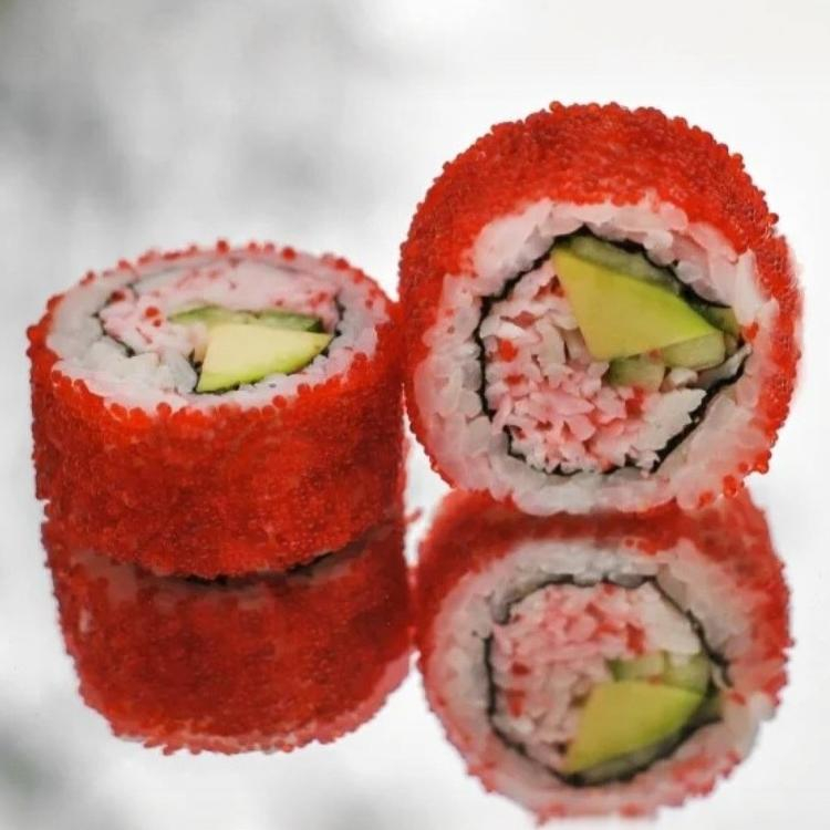 Рис, нори, краб, огурец, авокадо, в красной тобике.