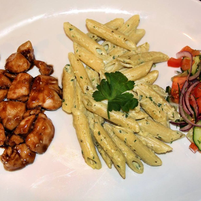 Курица, макароны, чобан салат.