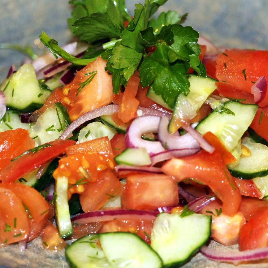 Помидоры, огурец, лук, лимон, зелень, оливковое масло.