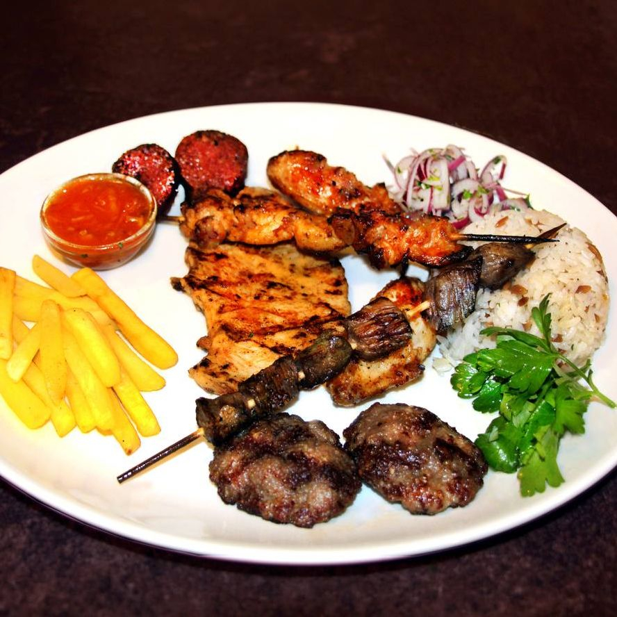 Куриные крылышки, говяжья котлета, суджук, лук, рис, томатный соус.