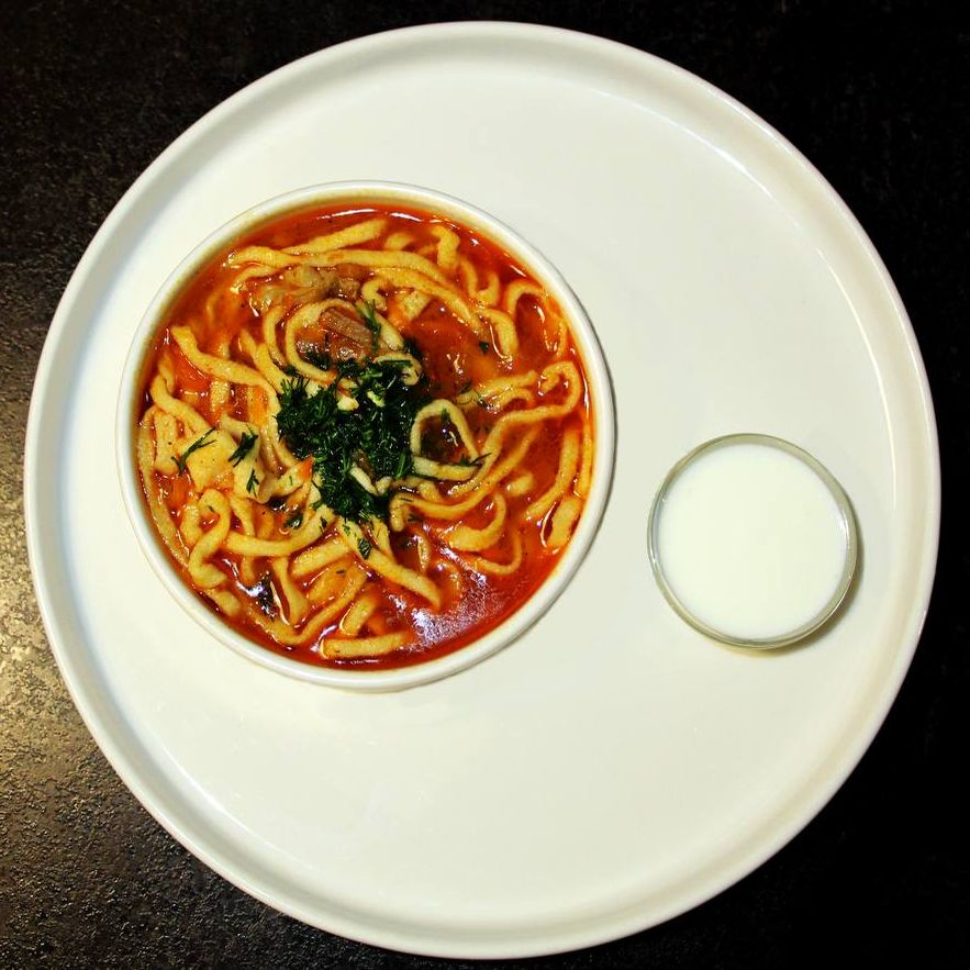 Лапша, говяжий бульон, специи, зелень.