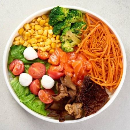 Рис, лосось, салат айсберг, кукуруза, грибы муэр, брокколи, помидоры черри, морковь по-корейски, моцарелла мини, соус манговый.