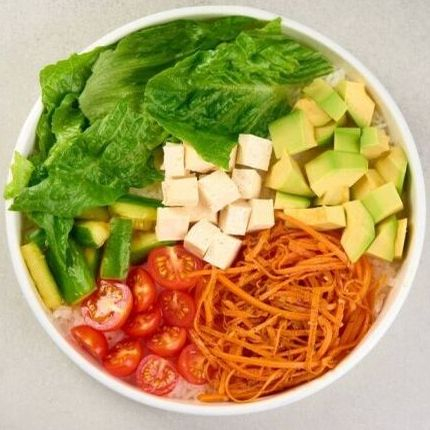 Рис, тофу, салат айсберг, битые огурцы, помидоры черри, авокадо, морковь по-корейски, лайм, соус манговый.