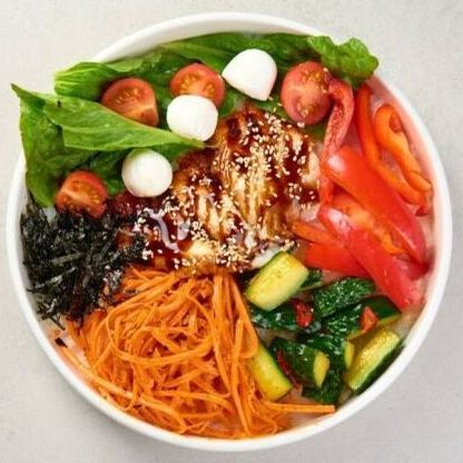 Рис, лосось, салат айсберг, кукуруза, грибы муэр, брокколи, помидоры черри, морковь по-корейски, моцарелла мини, соус манговый.