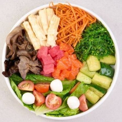 Рис, лосось, тунец, чука, грибы муэр, морковь по-корейски, битые огурцы, помидоры черри, соевая спаржа, салат Айсберг, моцарелла мини, лайм, кунжут, соевый соус.