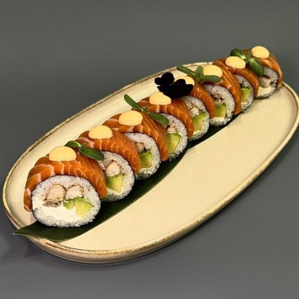Заказать Рис, нори, угорь, сыр творожный, авокадо, лосось, соус спайси.
