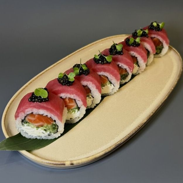 Заказать Рис, нори, сыр творожный, огурец, лосось, грибы муэр, соус трюфельный, лук зеленый.