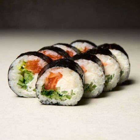Заказать Рис, нори, лосось, сыр творожный, огурец, салат Айсберг.