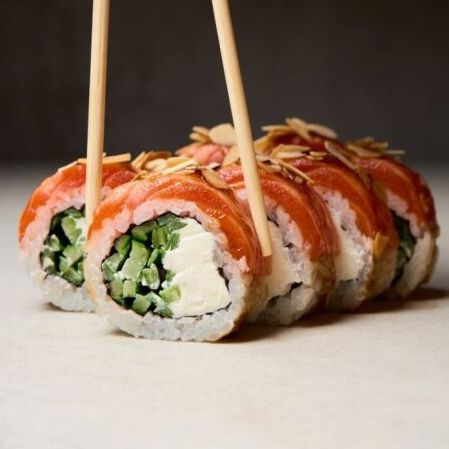 Заказать Рис, нори, лосось, сыр творожный, огурец, соус терияки, лепестки миндаля.