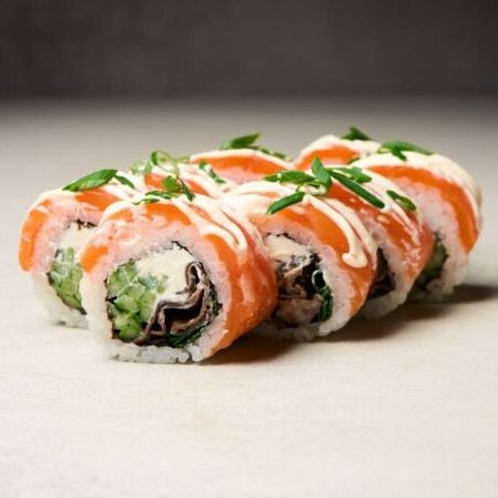 Заказать Рис, нори, сыр творожный, огурец, лосось, грибы муэр, соус трюфельный, лук зеленый.
