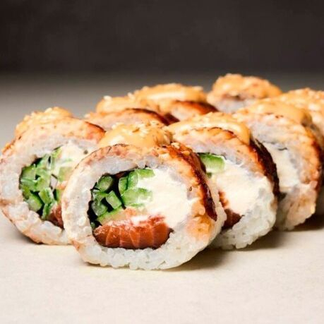 Заказать Рис, нори, лосось, угорь, сыр творожный, огурец, соус айоли, кунжут.
