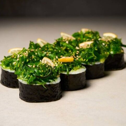 Заказать Рис, нори, креветка темпура, огурец, салат айсберг, сыр творожный, чука, лимон, кунжут.