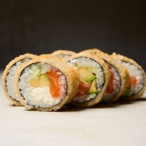 Заказать Рис, нори, лосось, сыр творожный, авокадо, сухари панко, тесто темпура.