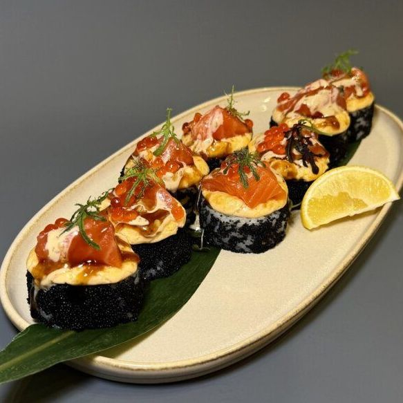 Заказать Рис, нори, авокадо, лосось, сыр творожный, сырно-чесночный соус, икра тобико.