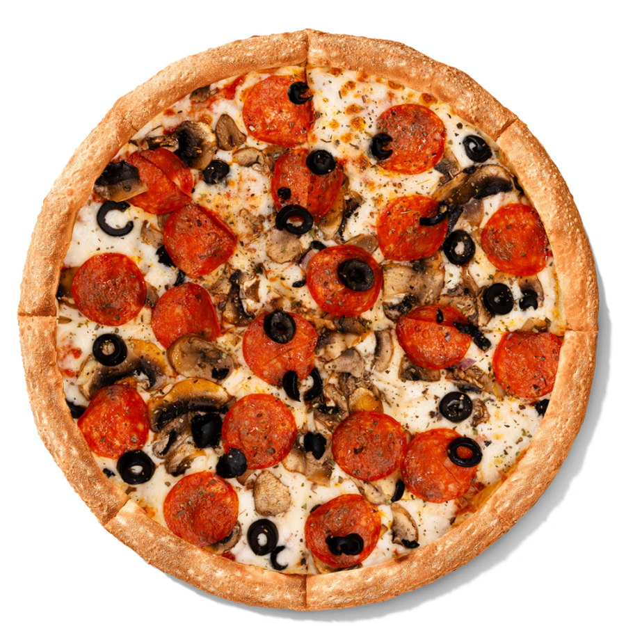 Заказать Томатный соус, сыр моцарелла, шампиньоны, пепперони, маслины, итальянские травы.