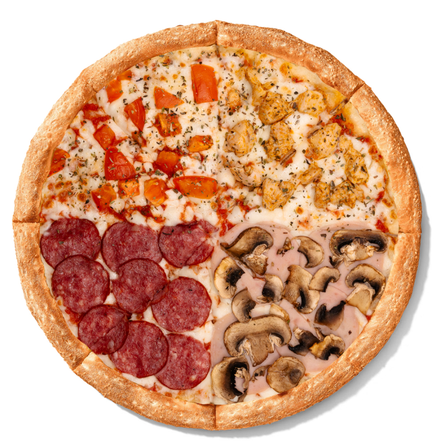 Заказать Томатный соус, сыр моцарелла, ветчина, шампиньоны, салями, цыпленок, томаты, итальянские травы.