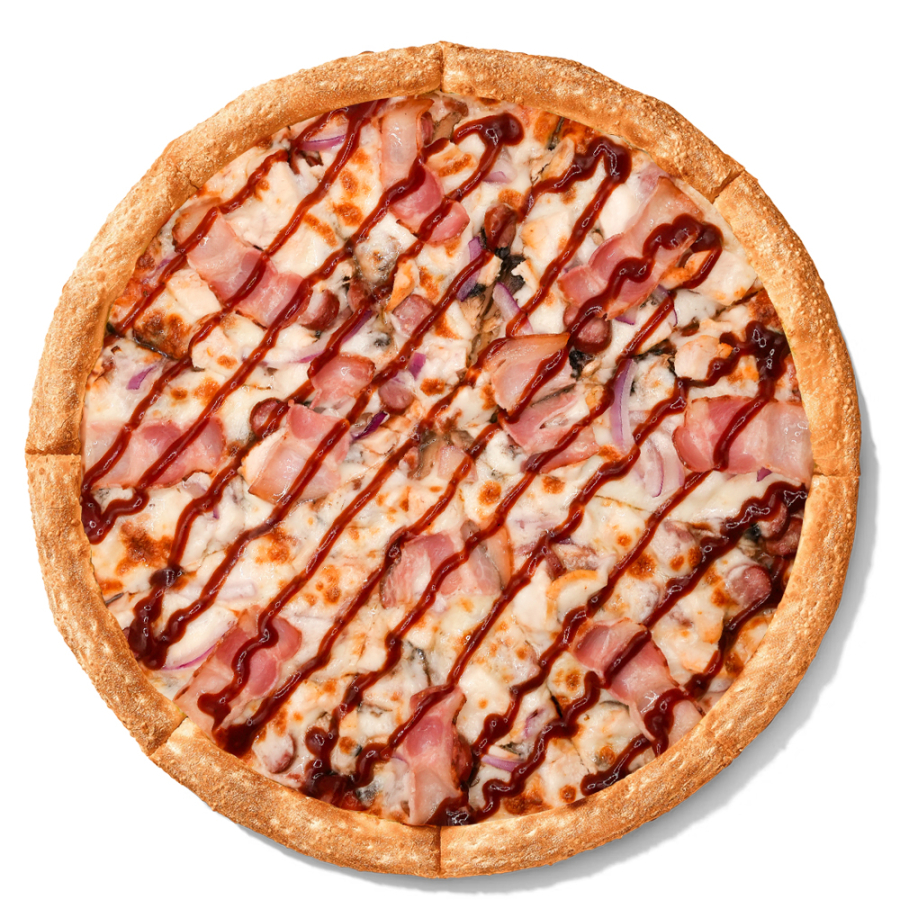 Заказать Томатный соус, сыр моцарелла, шампиньоны, бекон, охотничьи колбаски, цыпленок, лук, соус барбекю.
