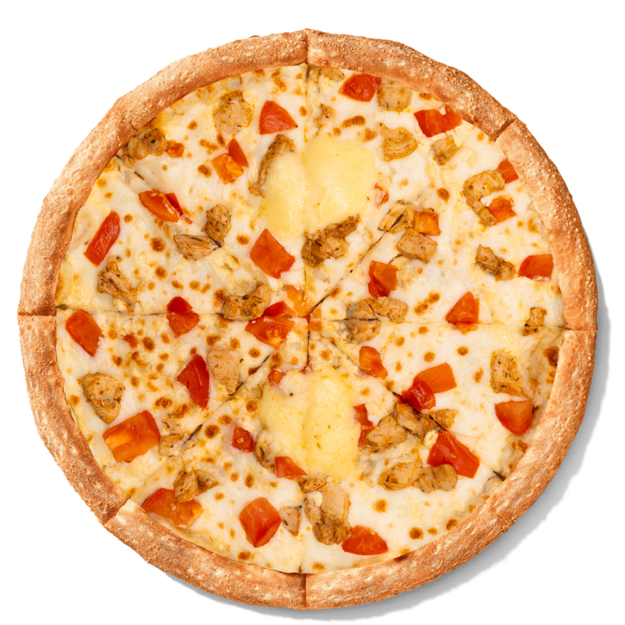 Заказать Соус пармеджано, сыр моцарелла, куриное филе, томаты, плавленый сыр.