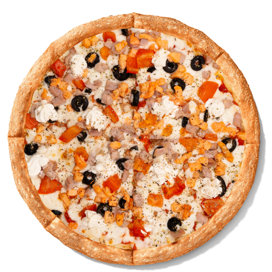 Томатный соус, сыр моцарелла, ветчина, шампиньоны, салями, цыпленок, томаты, итальянские травы.
