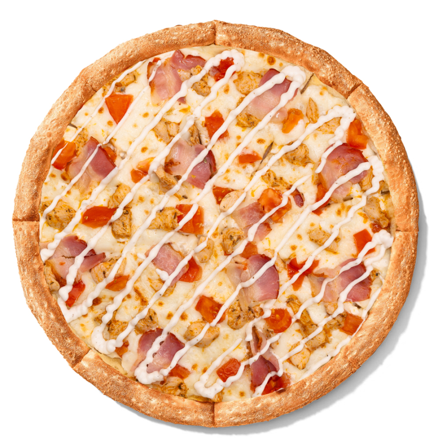 Заказать Соус ранч, сыр моцарелла, цыпленок, ветчина, бекон, томаты.