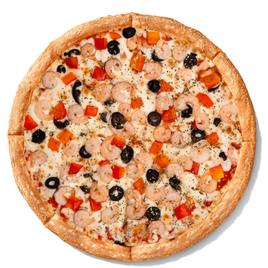 Заказать Томатный соус, сыр моцарелла, креветки, сладкий перец, маслины, итальянские травы.