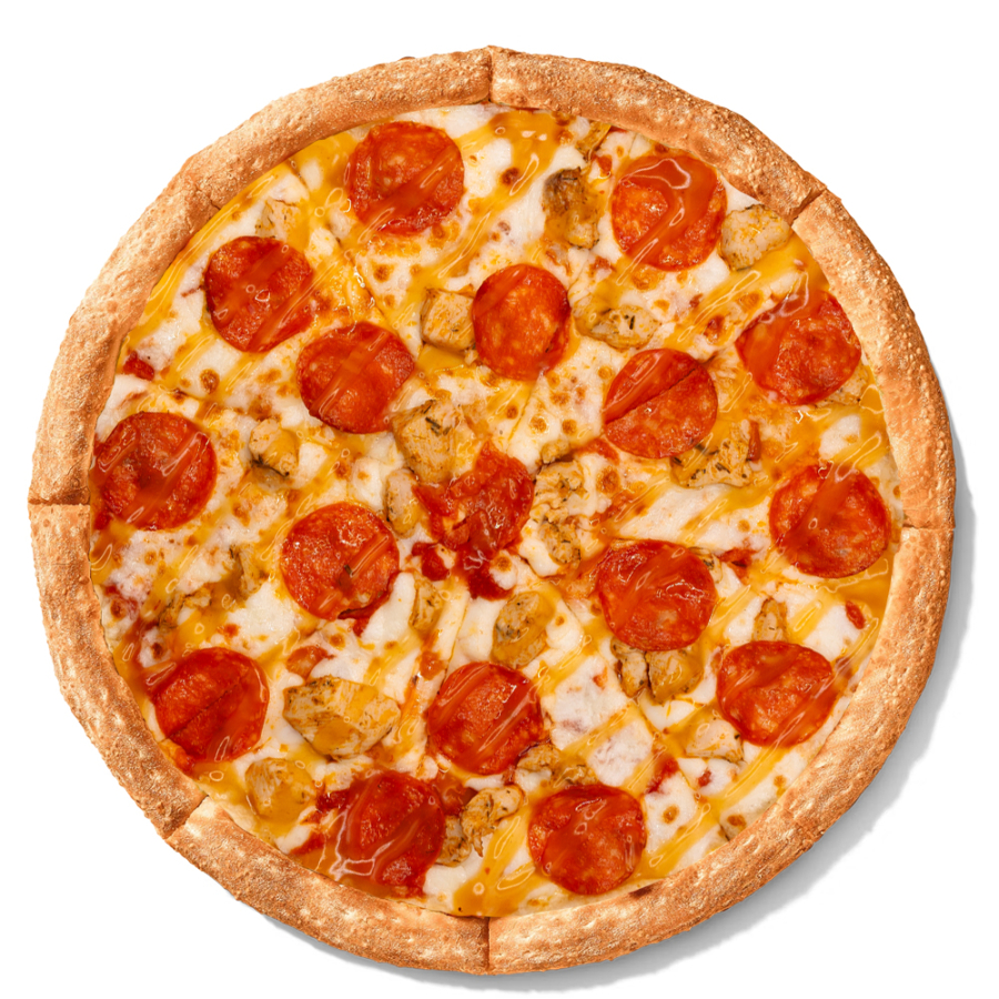 Заказать Томатный соус, сыр моцарелла, цыпленок, пепперони, кисло-сладкий соус.
