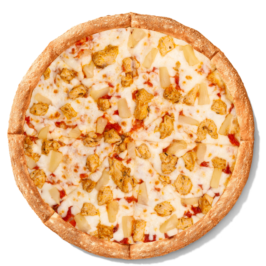 Томатный соус, сыр моцарелла, цыпленок, ананас.