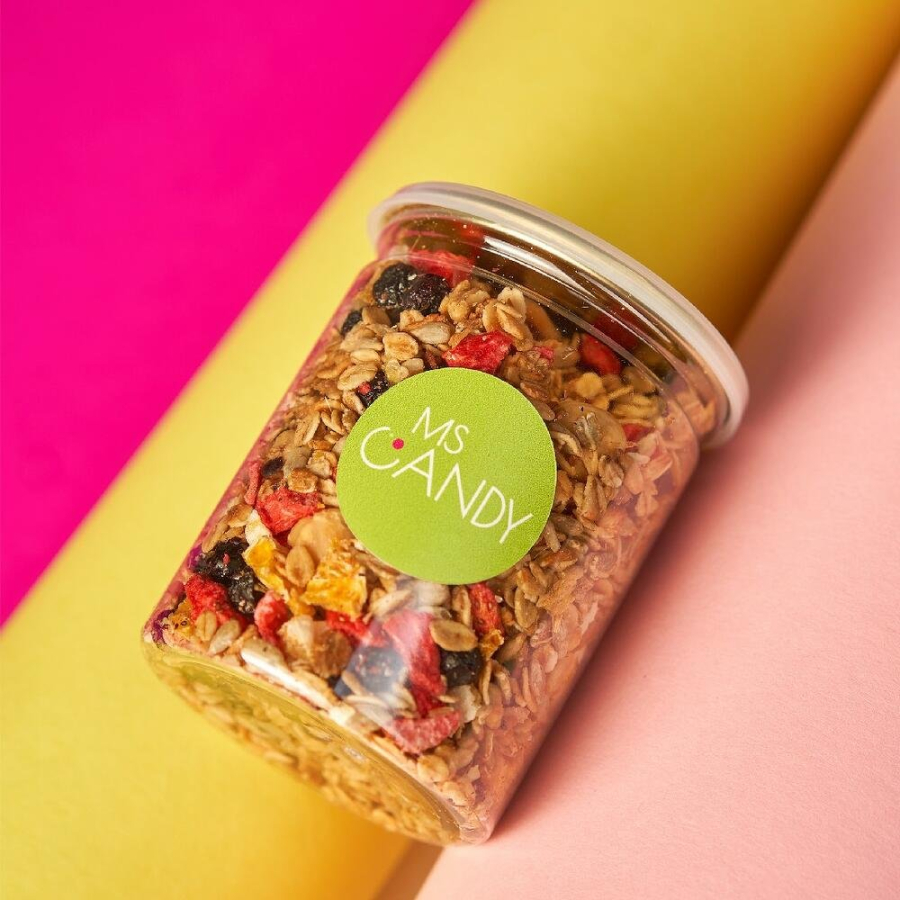 Овсяные и ржаные хлопья, семена подсолнечника, апельсиновый сок, мёд натуральный цветочный, кокосовое масло прямого отжима, грецкий орех, малина сублимированная, ананас сублимированный, лепестки ароматного миндаля.