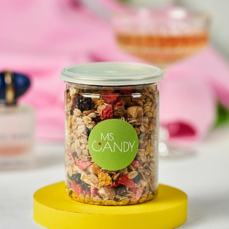 Овсяные и ржаные хлопья, семена подсолнечника, апельсиновый сок, кокосовое масло прямого отжима, мёд натуральный цветочный, фундук цельный, клубника сублимированная, апельсин сублимированный, черника сублимированная.