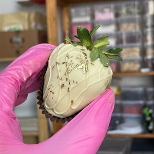 Одна ягодка клубники в белом бельгийском шоколаде (дизайн может отличаться).