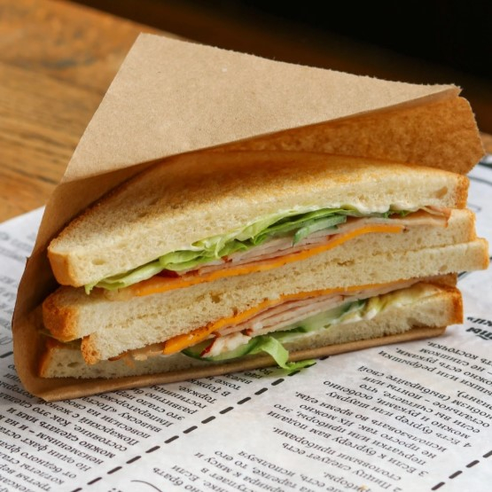 Заказать Обжаренный хлеб для тостов с ветчиной и сыром Чеддер. Добавляется салат айсберг, огурец, соус чесночный.