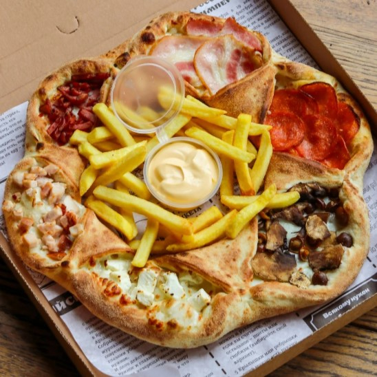 Пицца на тонком тесте делится на сектора и рассчитана для компании которая не может определится с выбором вкуса. Подается с соусом сырным и картофелем фри. Пепперони, курица, сыр фета, опята, колбаски, бекон, шампиньоны, картофель фри, соус.