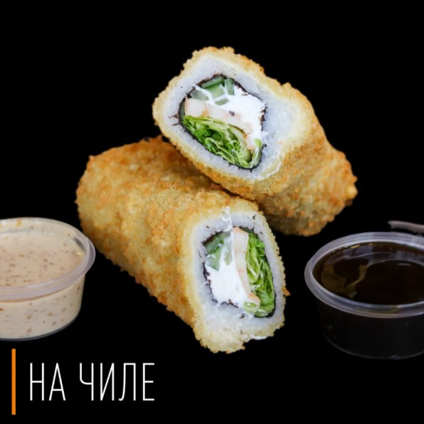 Рис с листом нори обжаренный во фритюре с добавлением творожного сыра, огурца и лосося с/с. Подаётся с соусами, кунжутом и икрой масаго.