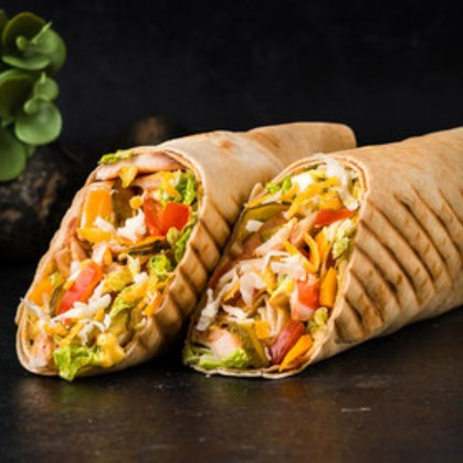 Лаваш, курица гриль, сыр чеддер, капуста, салат, томат, огурец свежий, соус цезарь.