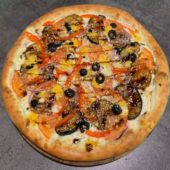 Соус Белый, соус Кисло-сладкий, сыр Моцарелла, цукини, баклажан, помидор, лук красный, чеснок, перец болгарский, сыр с плесенью, сыр «Чеддер», маслины, масло чесночное, винный уксус.